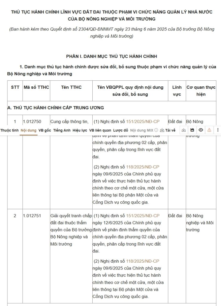 Ngày 23/6/2025, Bộ trưởng Bộ Nông nghiệp và Môi trường đã ban hành Quyết định số 2304/QĐ-BNNMT, công bố danh mục thủ tục hành chính lĩnh vực đất đai nằm trong phạm vi chức năng quản lý Nhà nước của Bộ.